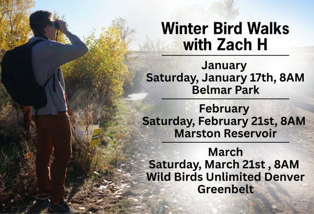During this guided walk, participants will learn the basics of birdwatching, including how to find and identify birds. Topics may cover the use of optics, where to look and listen for birds, and birding etiquette. You’ll also have the chance to observe common migratory and resident birds of Colorado in different habitats. There is no cost for joining this walk.